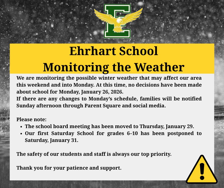 Ehrhart Families,We are monitoring the possible winter weather that may affect our area this weekend and into Monday. At this time, no decisions have been made about school for **Monday, January 26...