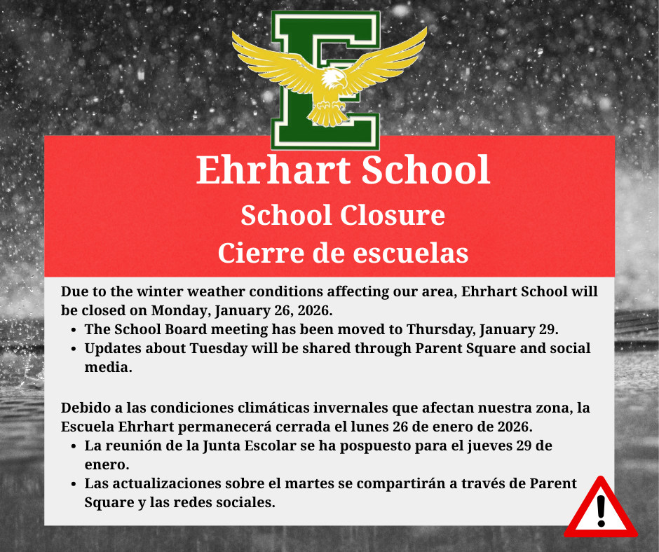 Ehrhart Families, Out of an abundance of caution, Ehrhart School will be closed on Monday, January 26, 2026. You will be notified via Parent Square and social media if any additional changes are...