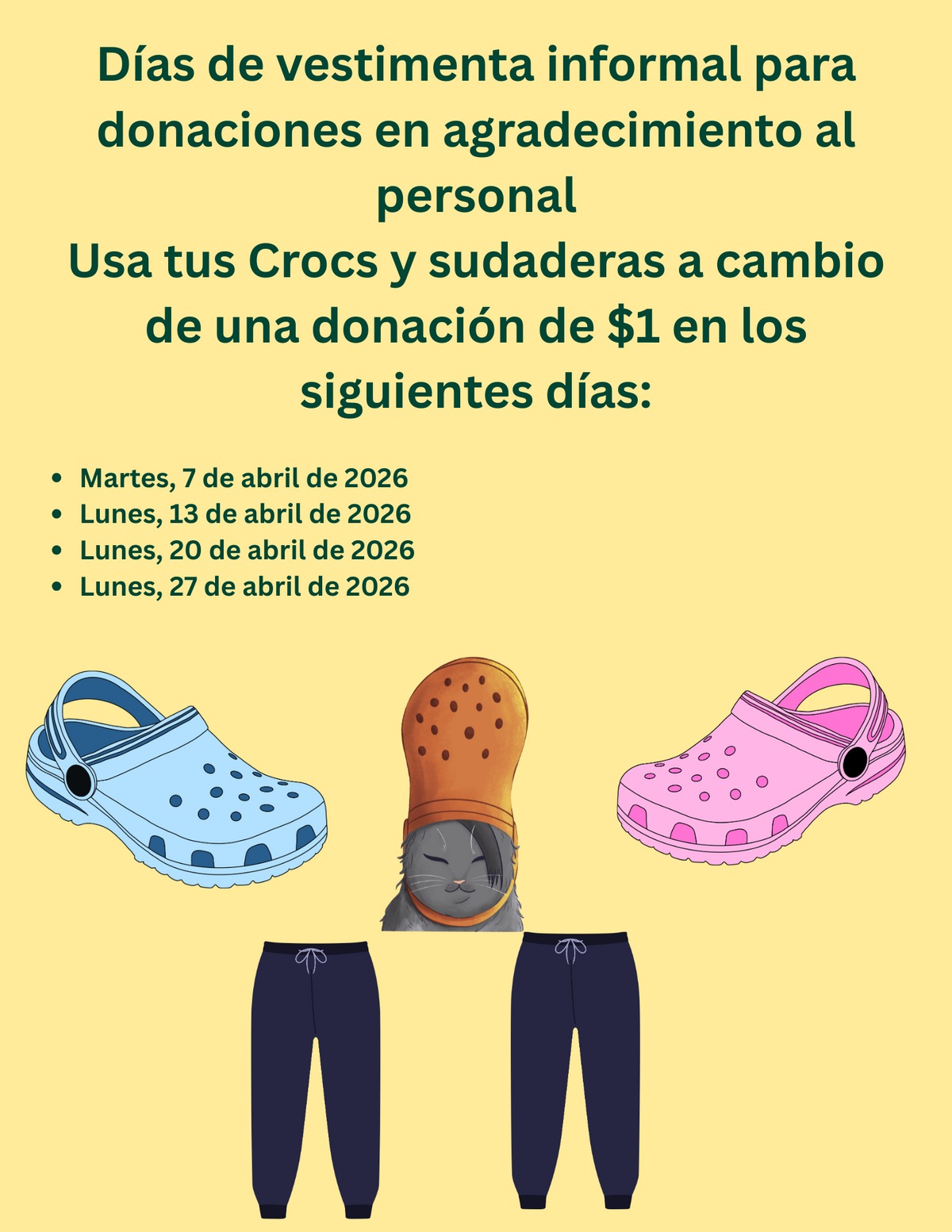 Los estudiantes pueden hacer una donación para apoyar a nuestro increÃble personal de Ehrhart y asà ganar la oportunidad de usar Crocs y pants deportivos en este dÃa especial.